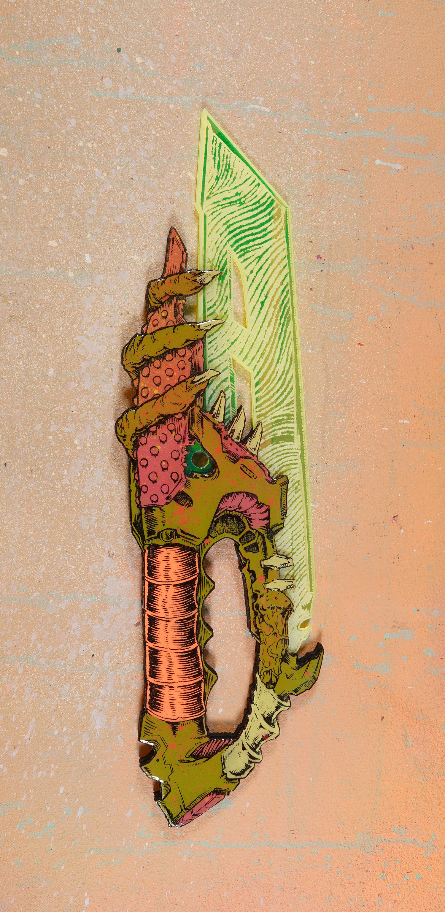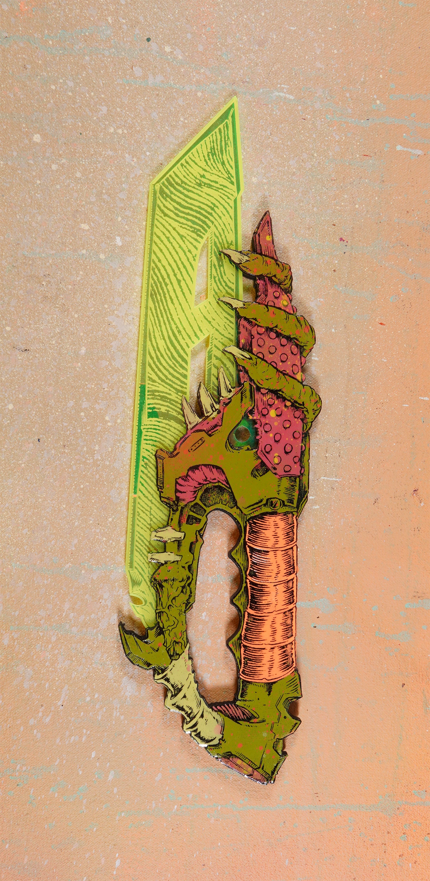 These are 3 layers of wood and acrylic. Double-sided laser engraved wood with an engraved acrylic blade. The blade has applied dichroic film to the fluorescent acrylic before engraving so it creates an interesting reflection and color.